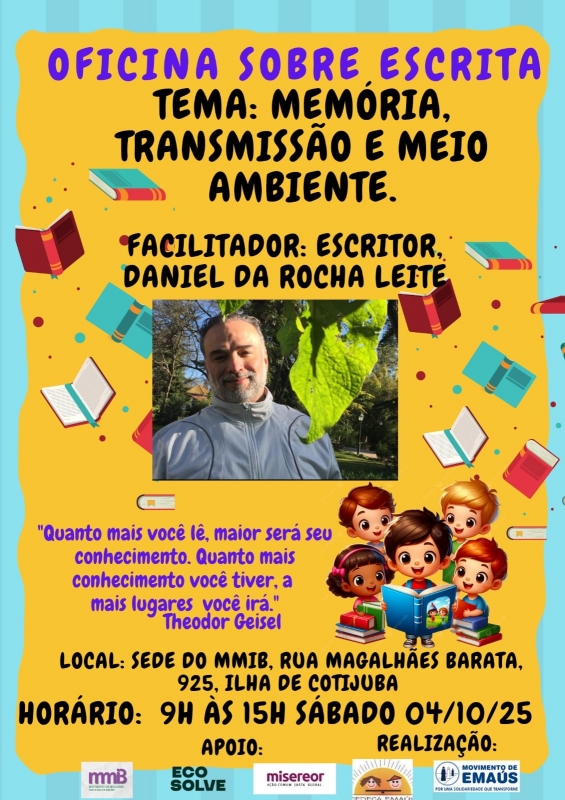 O Cedeca Emaús por meio do Projeto: Mobilização Contra Violações Ambientais - protegendo vidas na Amazônia faz acontecer no coração do Movimento de Mulheres das Ilhas de Belém (MMIB), um encontro especial no dia 4 de outubro de 2025, sábado, dedicado a despertar a sensibilidade literária dos adolescentes da comunidade insular. Por meio das palavras do escritor Daniel da Rocha Leite, a oficina “Memória, transmissão e meio ambiente”, convida jovens corações a ouvir, sentir e escrever com leveza e compromisso, inspirando-se na riqueza cultural da Amazônia paraense.