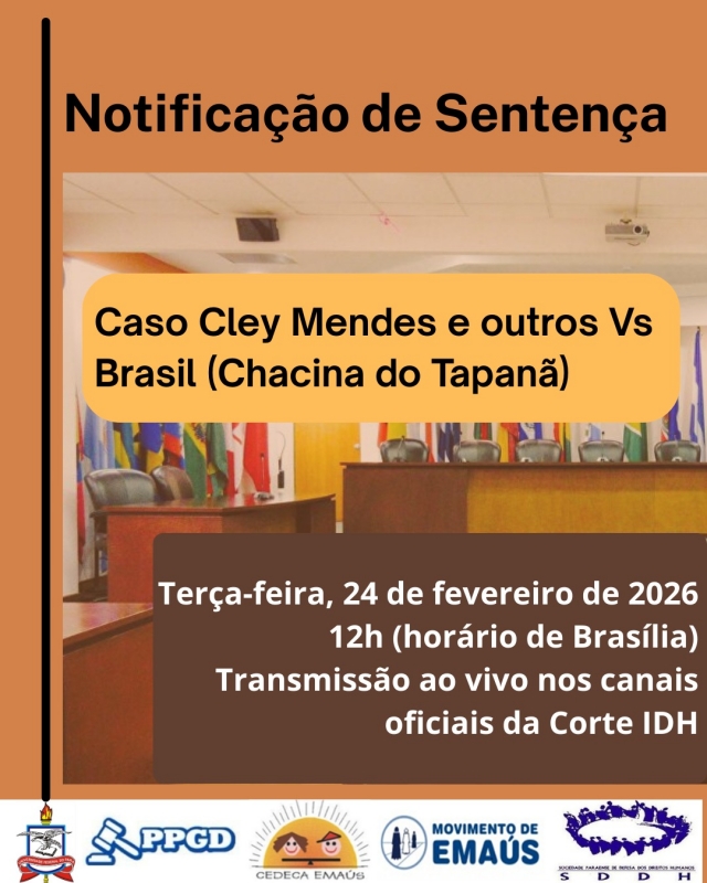 #ParaTodosVerem Notificação de Sentença, Caso Cley Mendes e outros Vs Brasil (Chacina do Tapanã). Terça-feira, 24 de fevereiro de 2026, 12 horas, horário de Brasília, transmissão ao vivo pelos canais oficiais da Corte Interamericana de Direitos Humanos